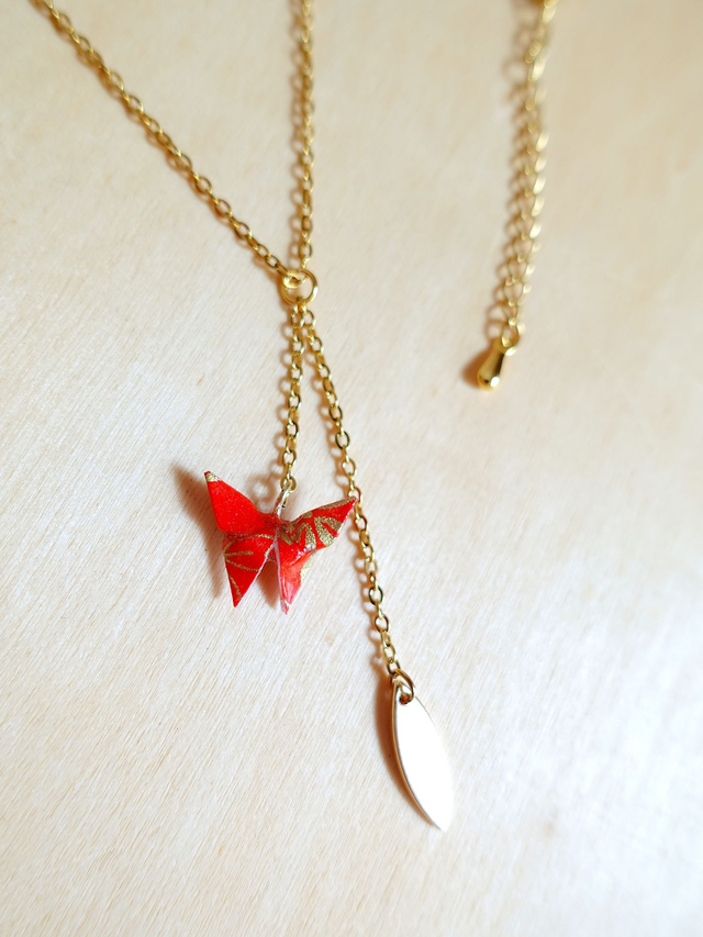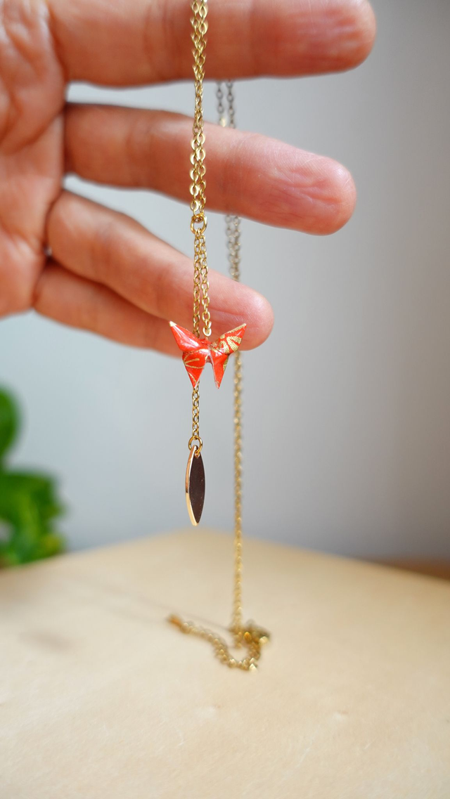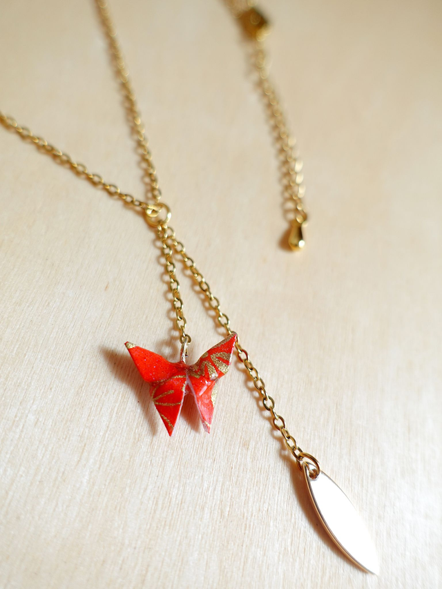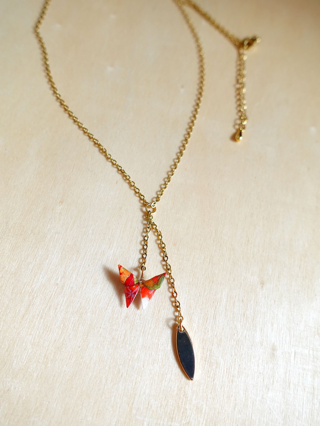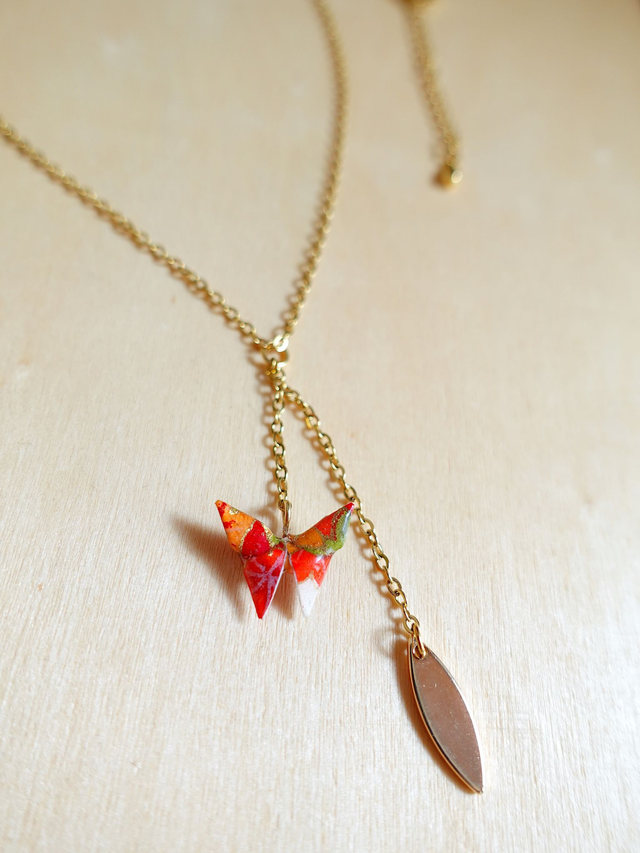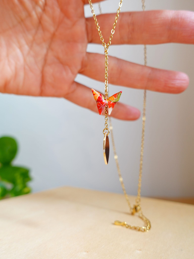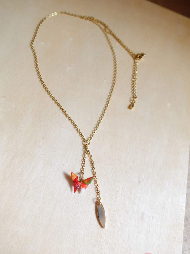 Collier origami / INOX doré / Origami papillon / Papier japonais washi / Orange, vert, or /