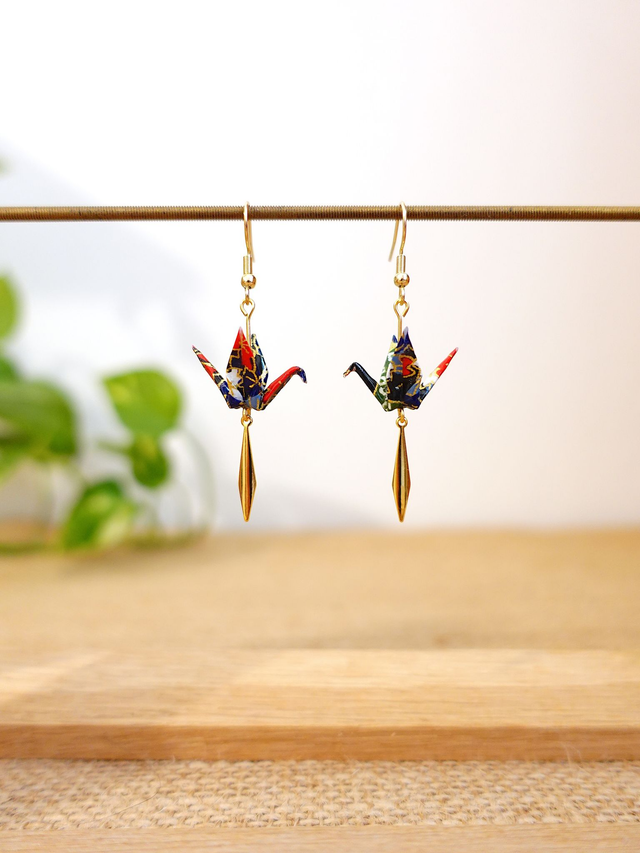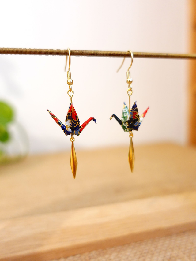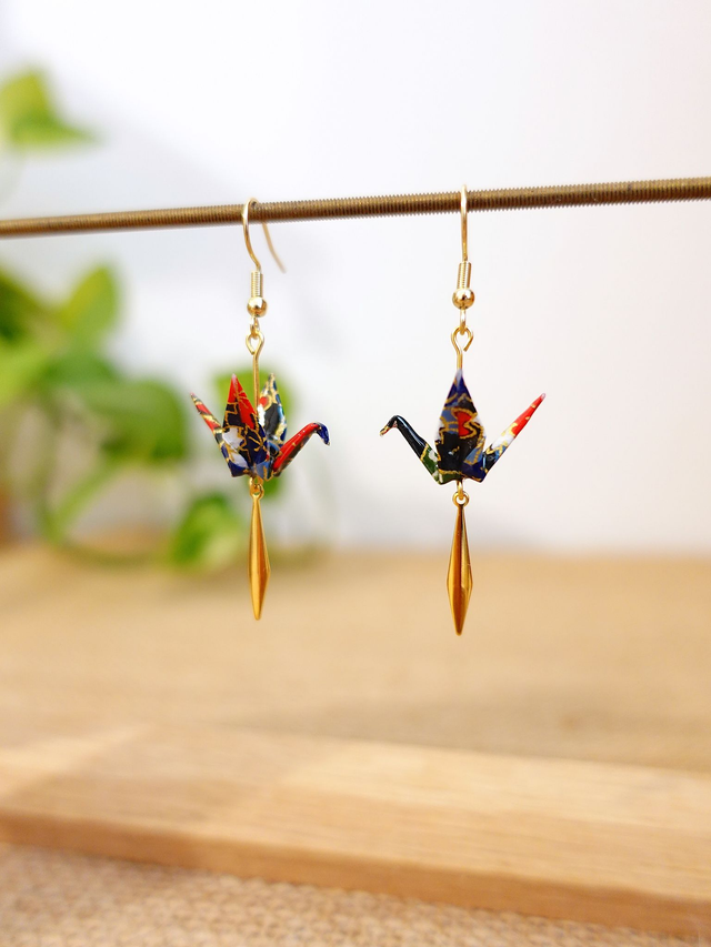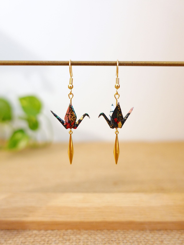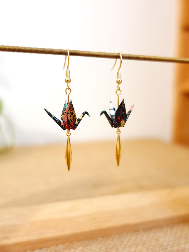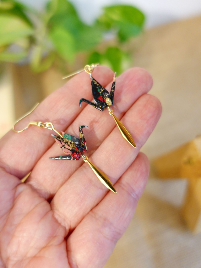 INOX doré / Origami grues, oiseaux / Papier japonais washi / Noir, or/ Boucles d'oreilles origami /