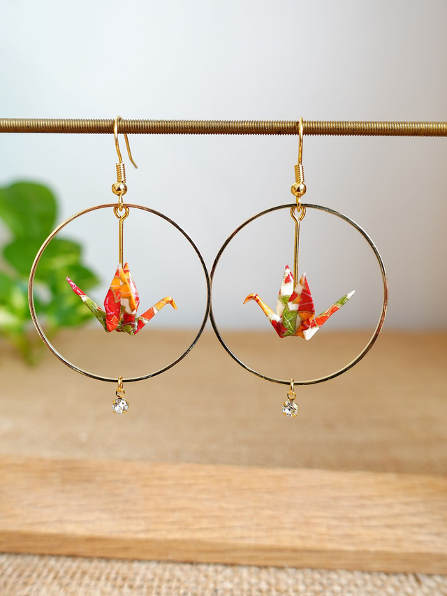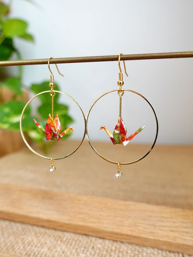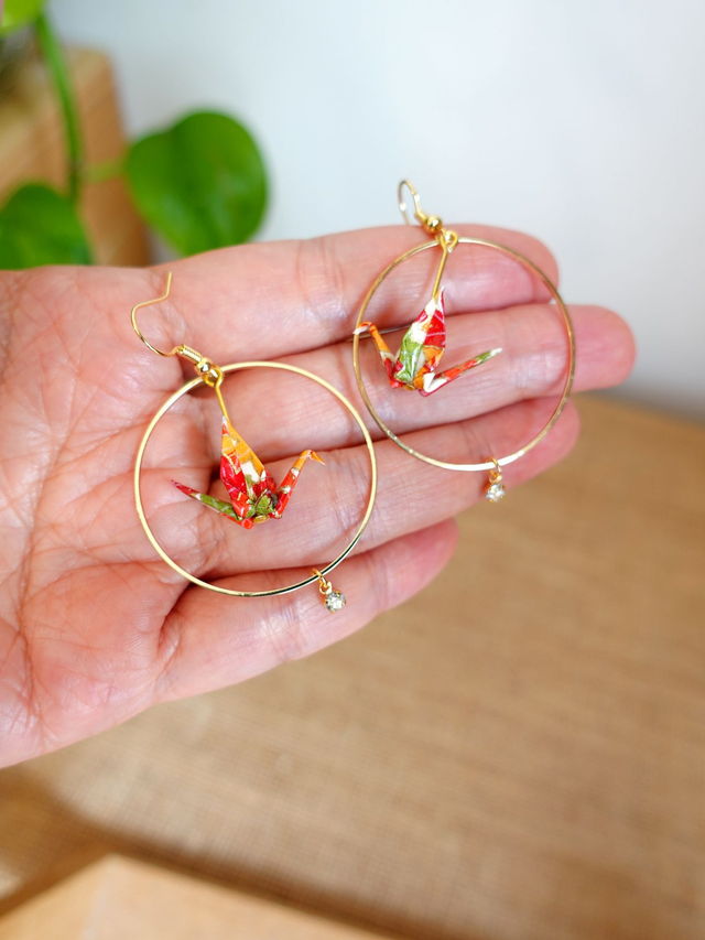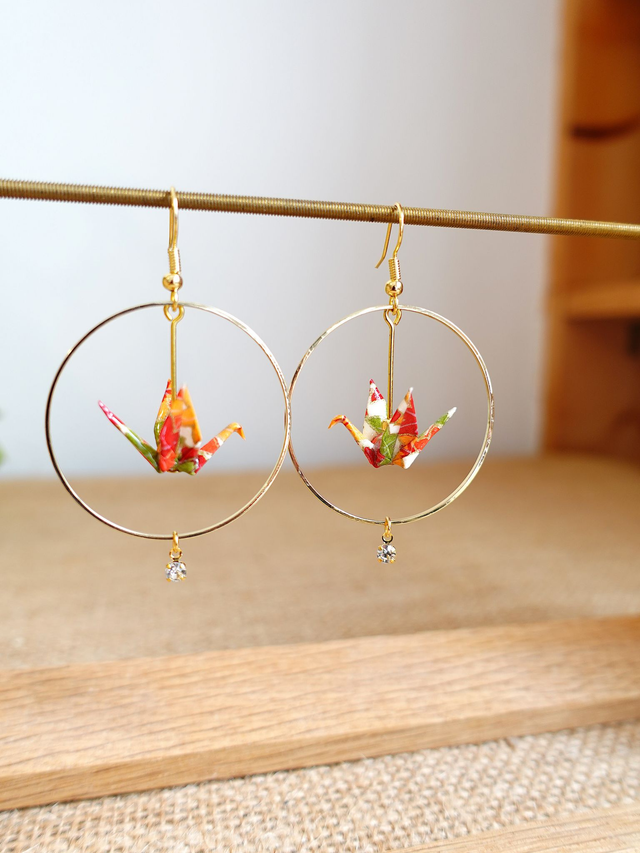Oiseaux, Grue en Origami / Crochets plaqué or 14K / Papier japonais washi / Orange, Or / Créole, Anneaux / Boucles d'oreilles / Bijou origami /
