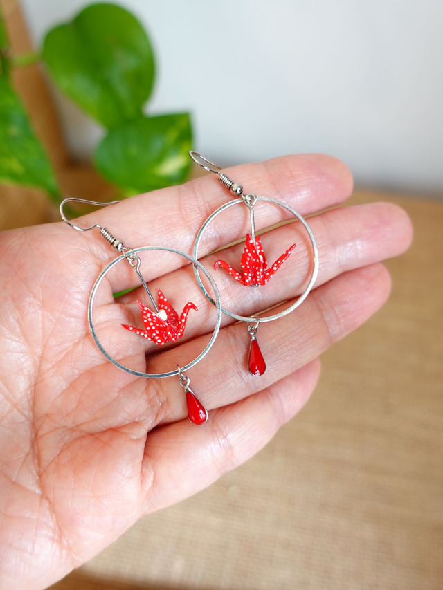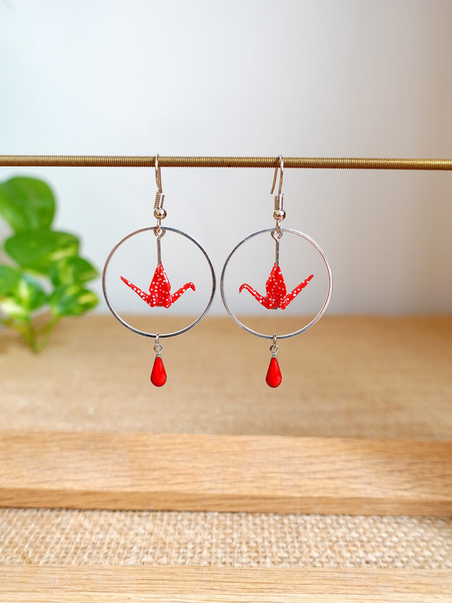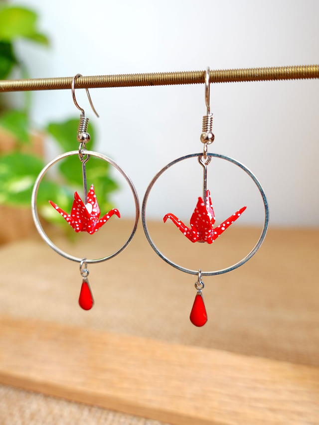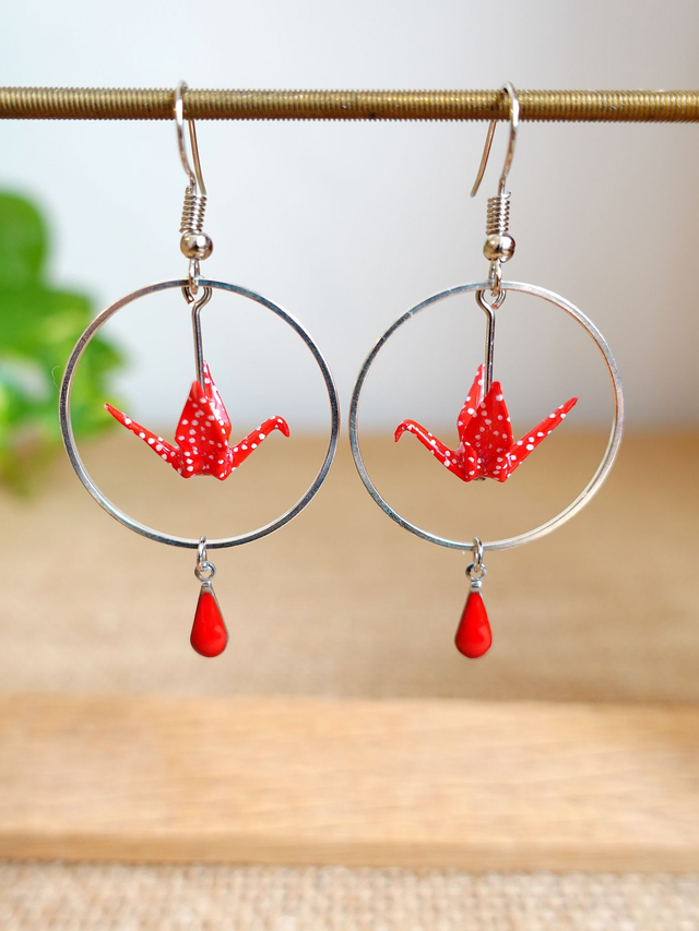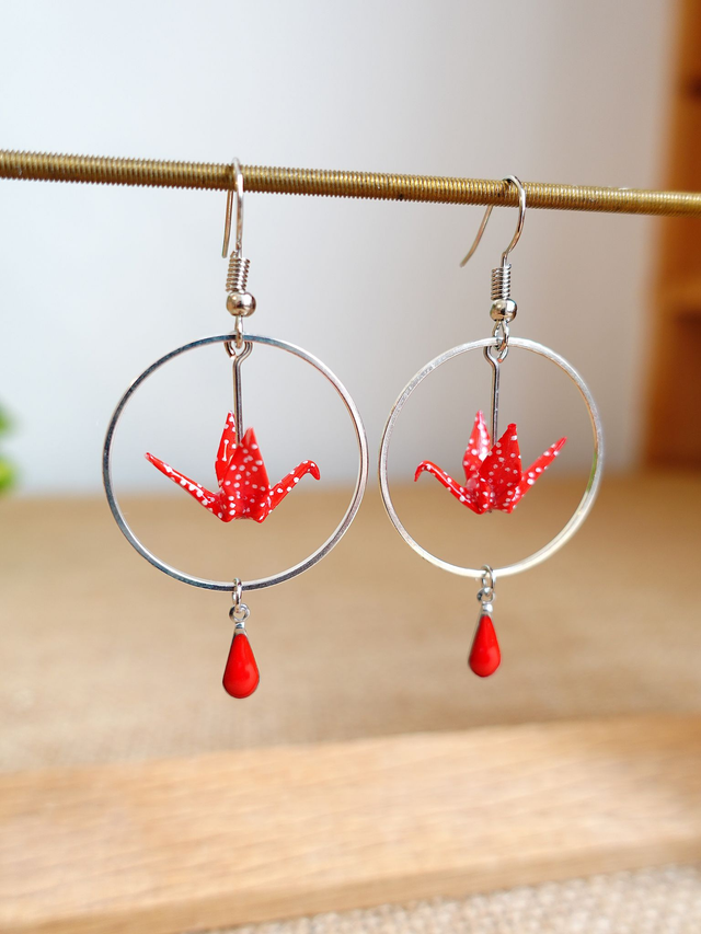 Oiseaux, Grue en Origami / Papier japonais washi / Rouge à pois / Créole, Anneaux / Boucles d'oreilles / Bijou origami /