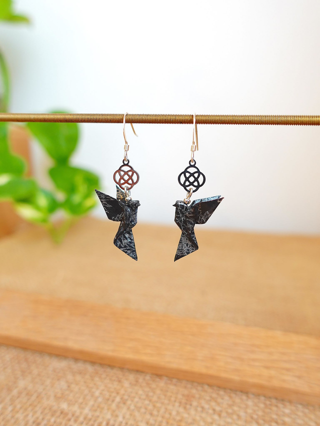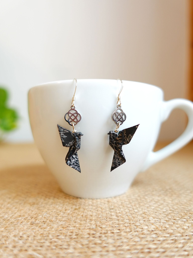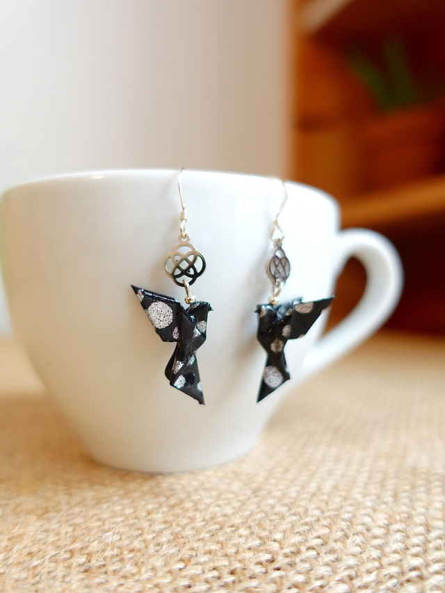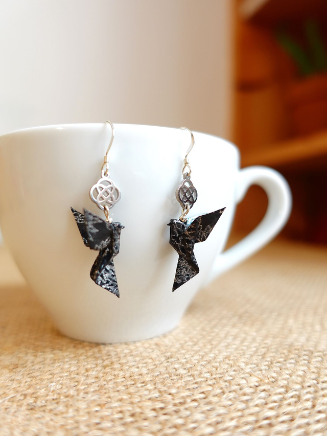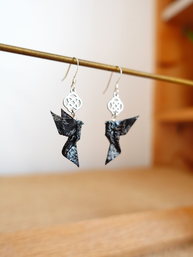 Origami Colombe, oiseau / Argent 925 / Boucles d'oreilles / Papier japonais washi / Noir, argent / Bijou japonais origami /