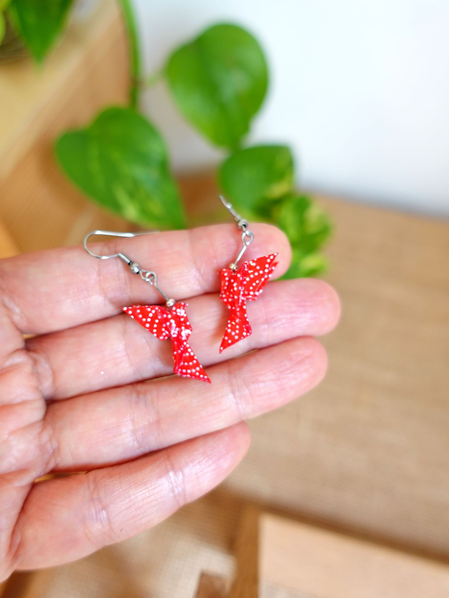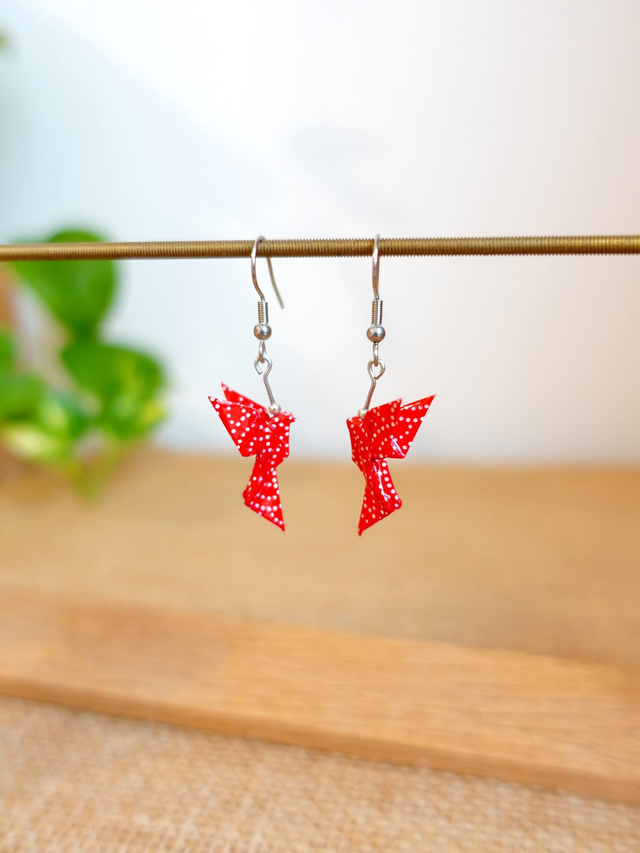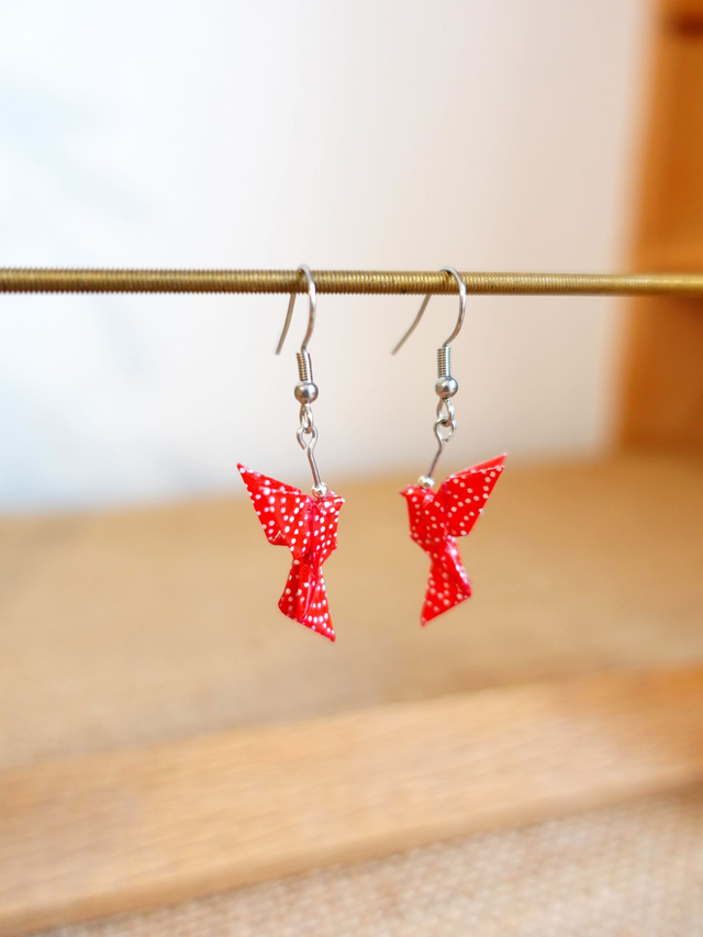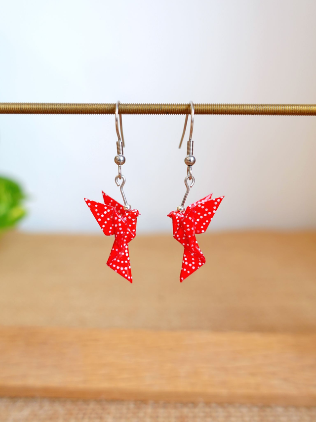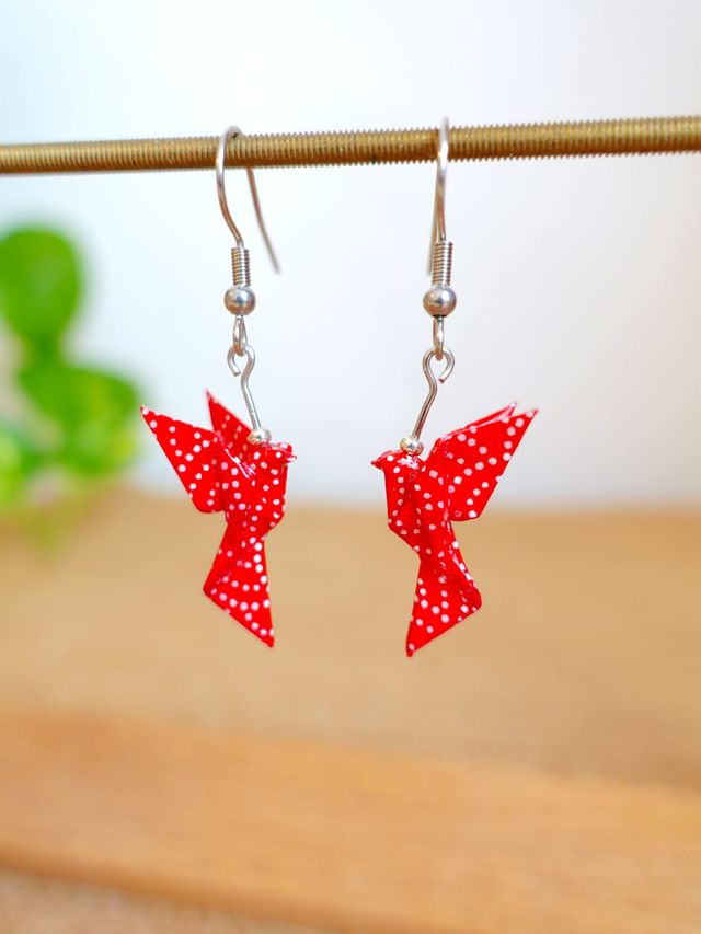 Origami Colombe, oiseau / INOX / Boucles d'oreilles / Papier japonais washi / Rouge à pois blancs, Argent / Bijou japonais origami /