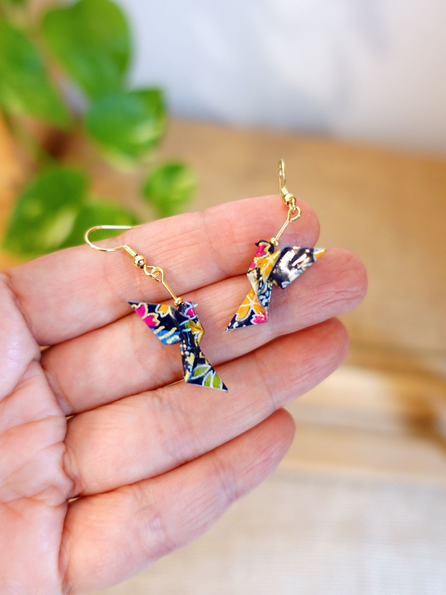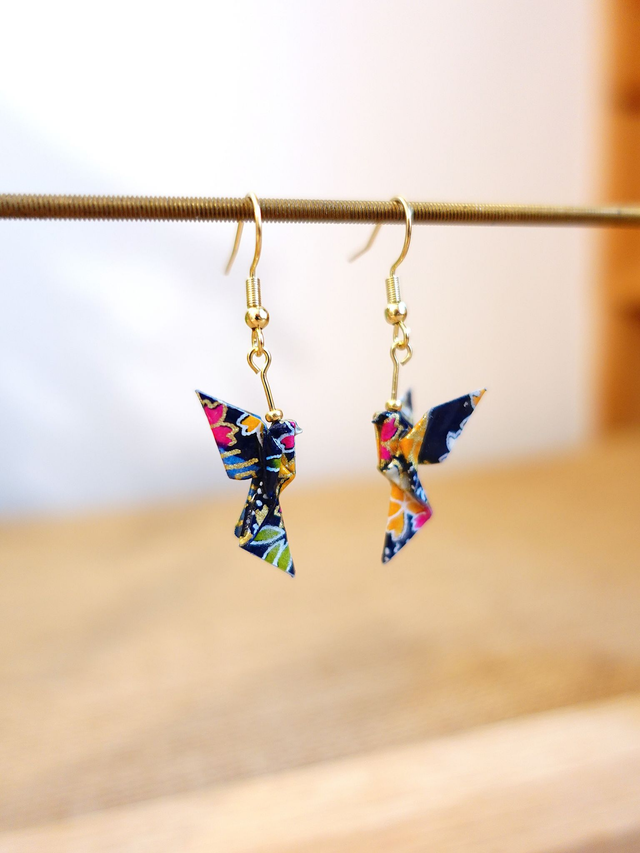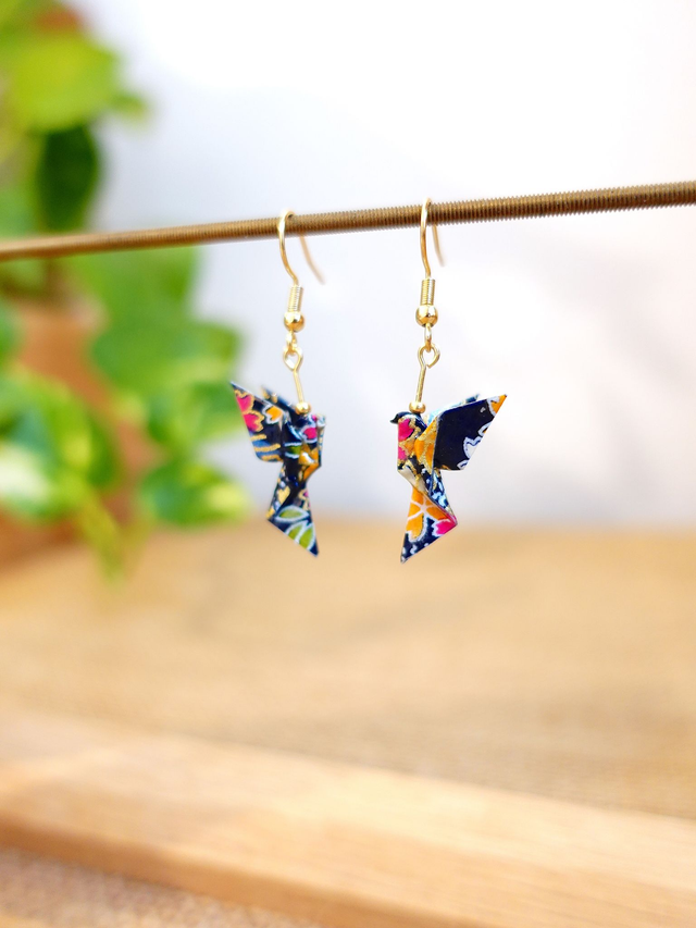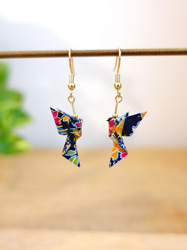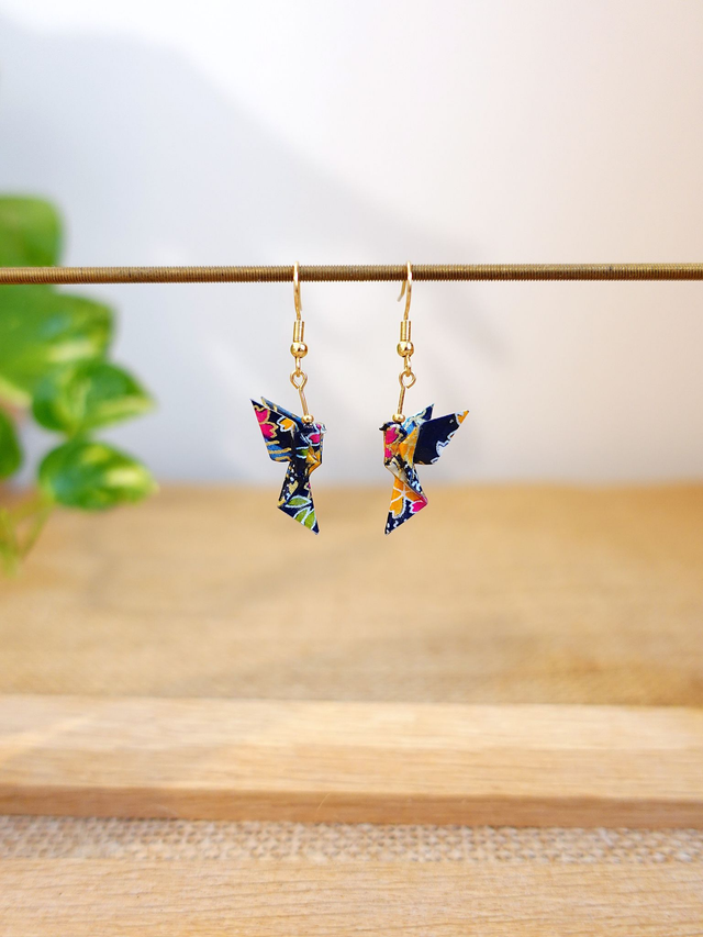 Origami Colombe, oiseau / INOX doré / Boucles d'oreilles / Papier japonais washi / Bleu nuit, multicolore, or / Bijou japonais origami /