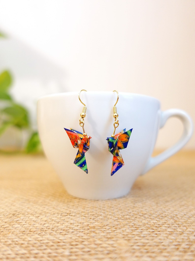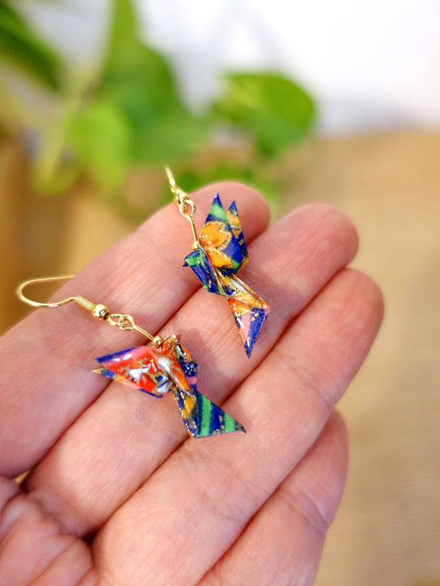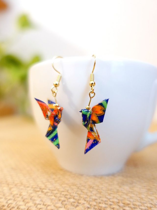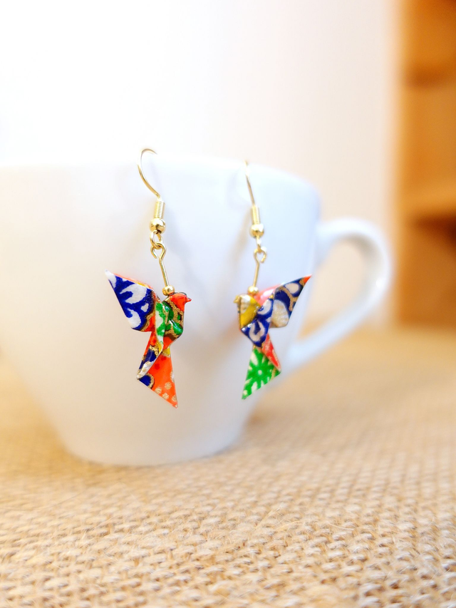 Origami Colombe, oiseau / INOX doré / Boucles d'oreilles / Papier japonais washi / Multicolore, or / Bijou japonais origami /
