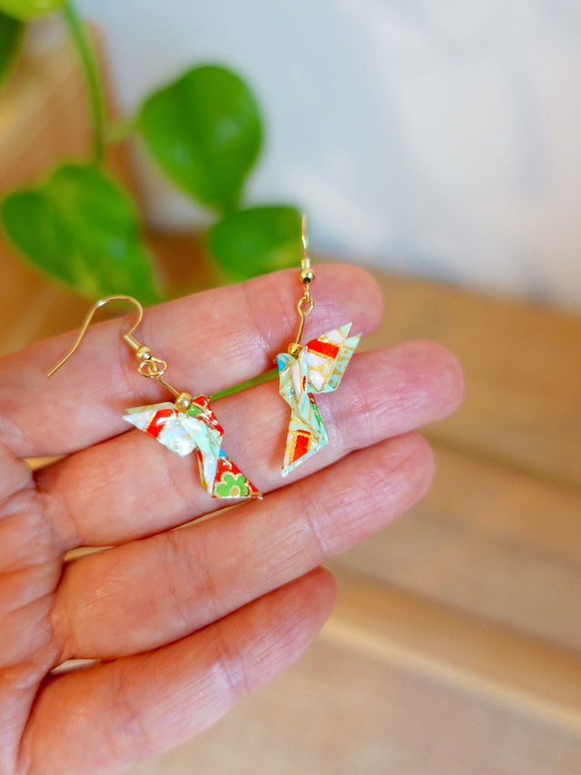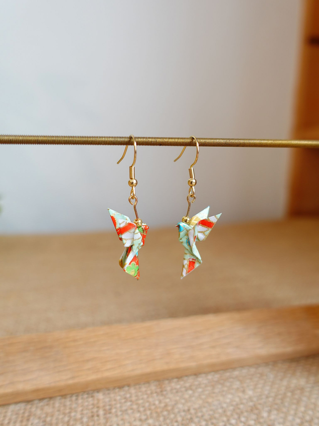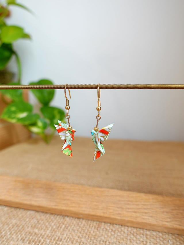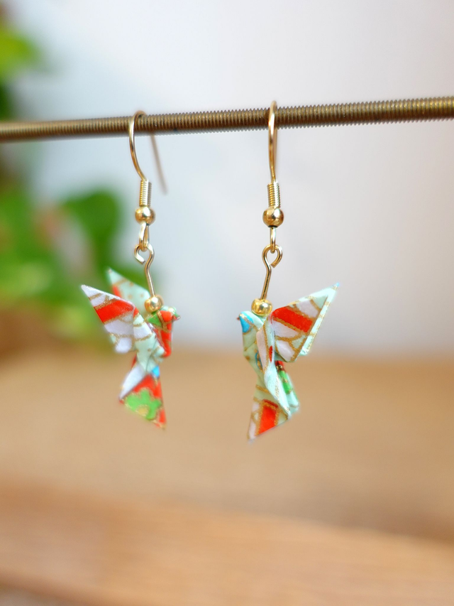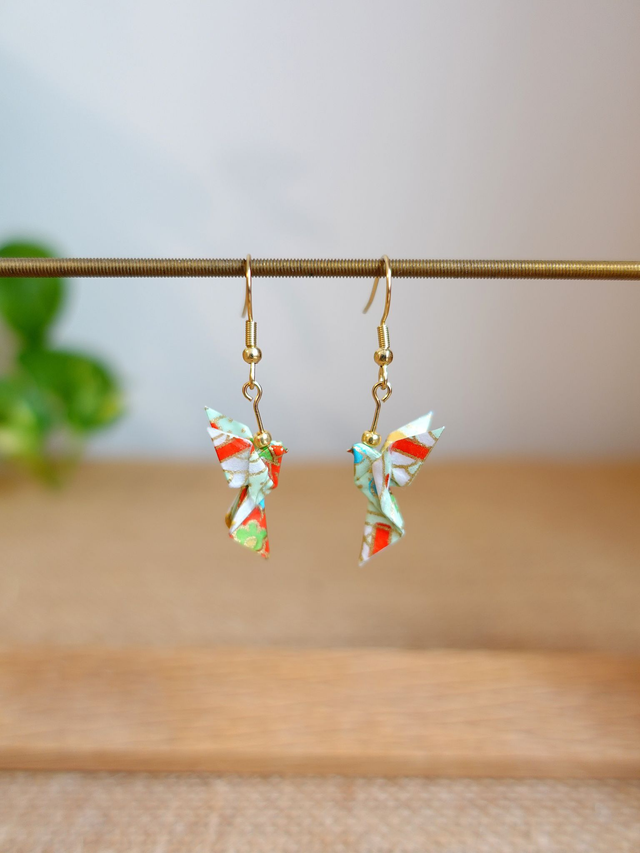 Origami Colombe, oiseau / INOX doré / Boucles d'oreilles / Papier japonais washi / Vert clair, orange, or / Bijou japonais origami /