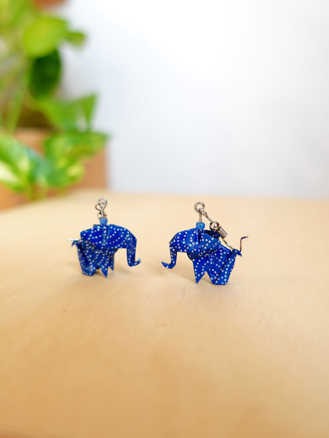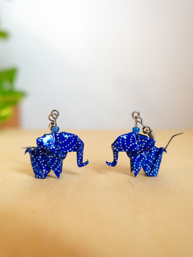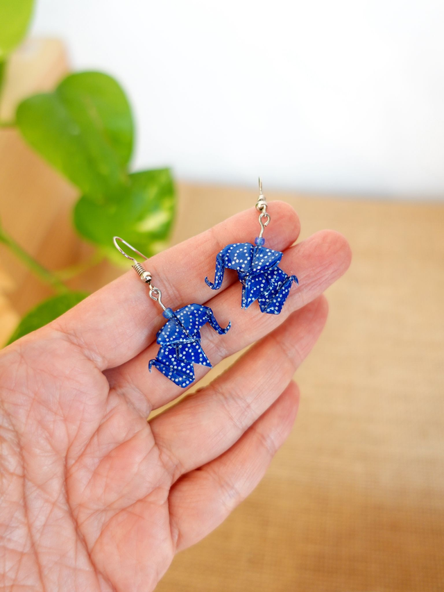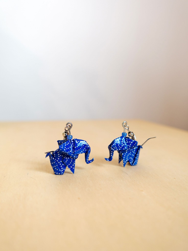 Origami Eléphant / Papier japonais washi / Bleu à pois / Bijou japonais origami / Boucles d'oreilles /