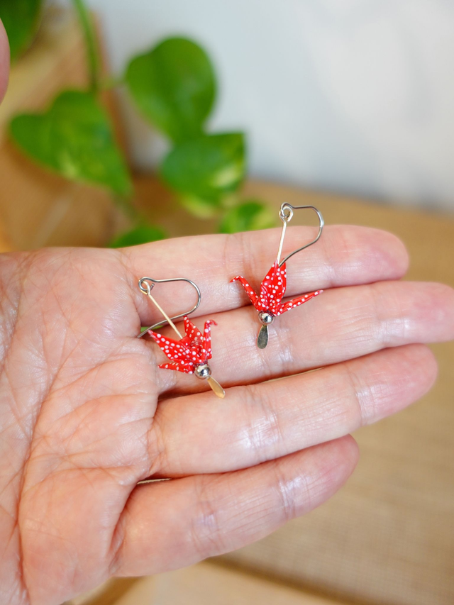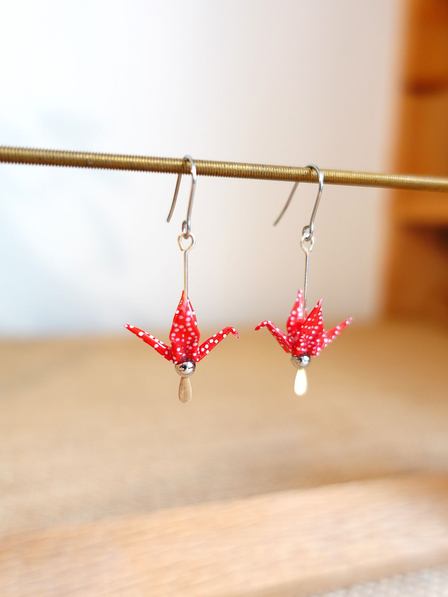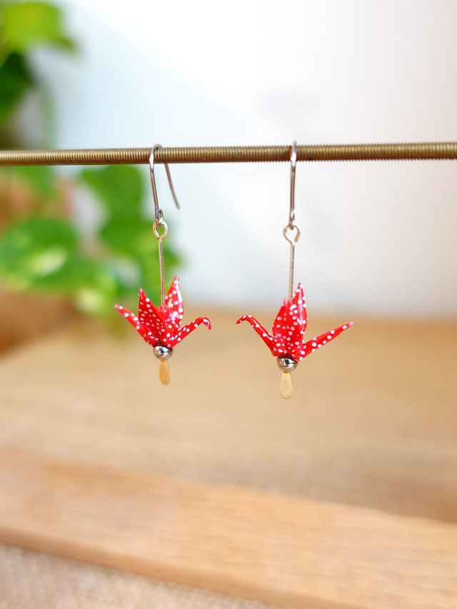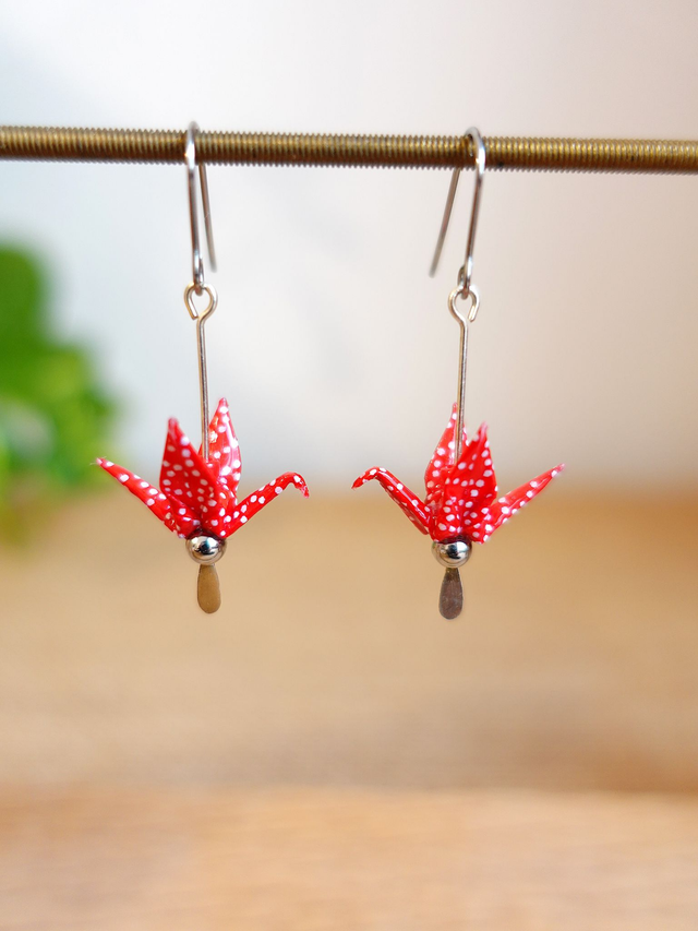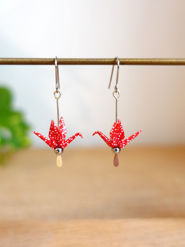 Origami oiseaux, grues / Inox + Argent / Papier japonais washi / Rouge à pois, argent / Boucles d'oreilles / Bijou origami /