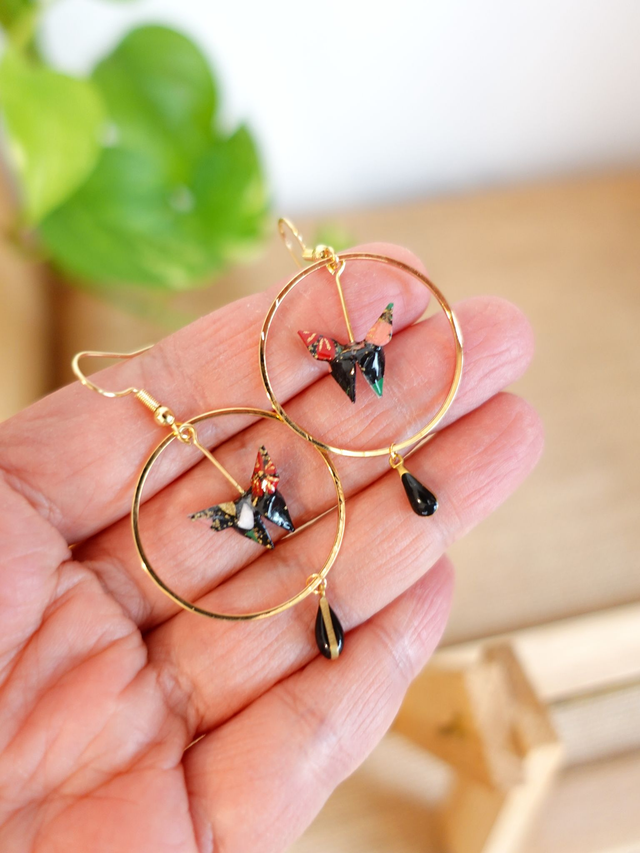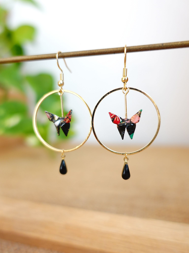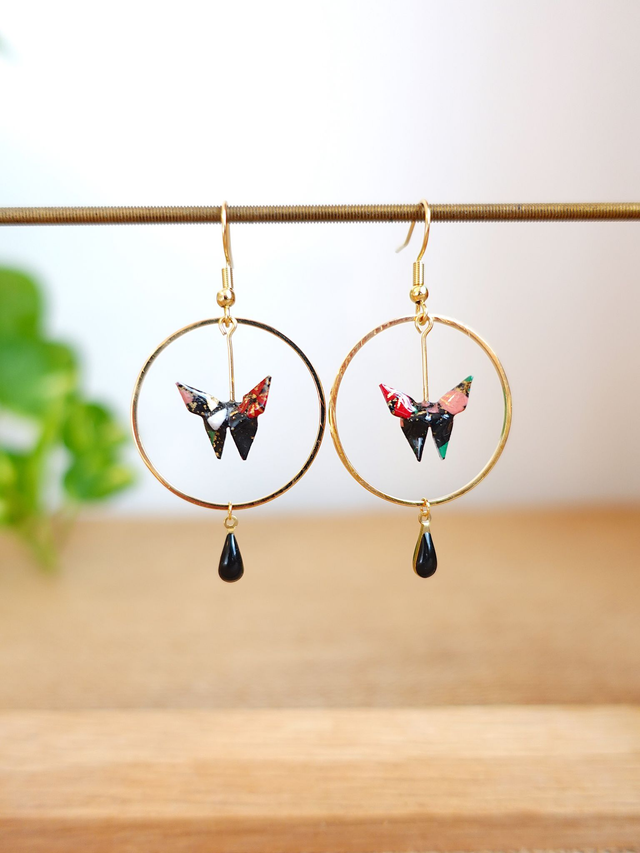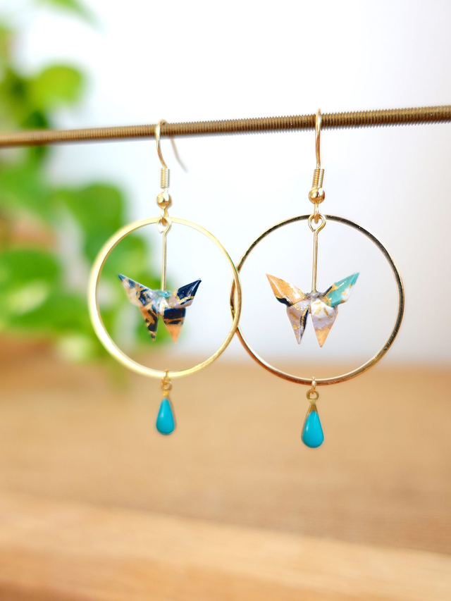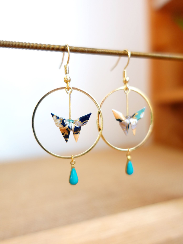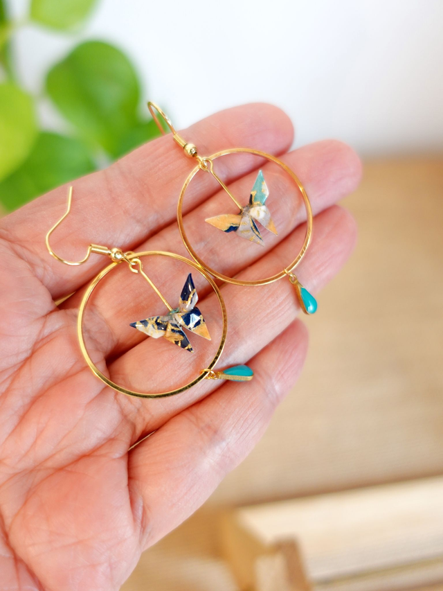 Origami Papillon / INOX doré / Papier japonais washi / Bleu, Noir, or / Créoles, anneaux / Bijou japonais origami / Boucles d'oreilles /