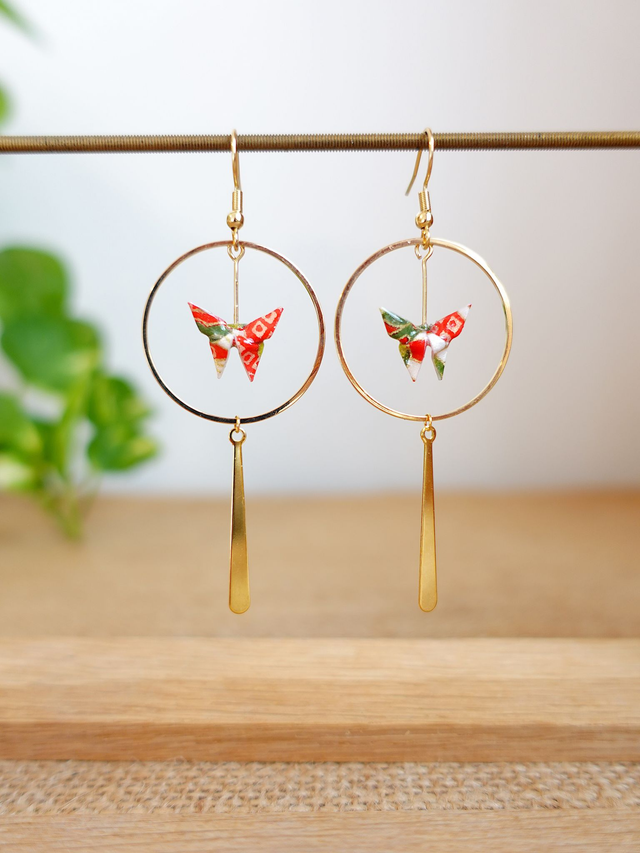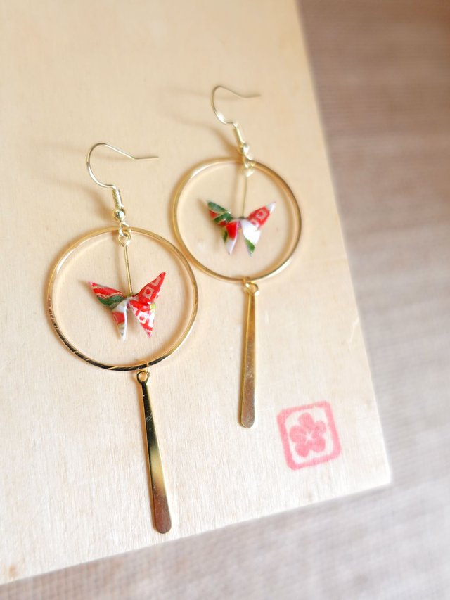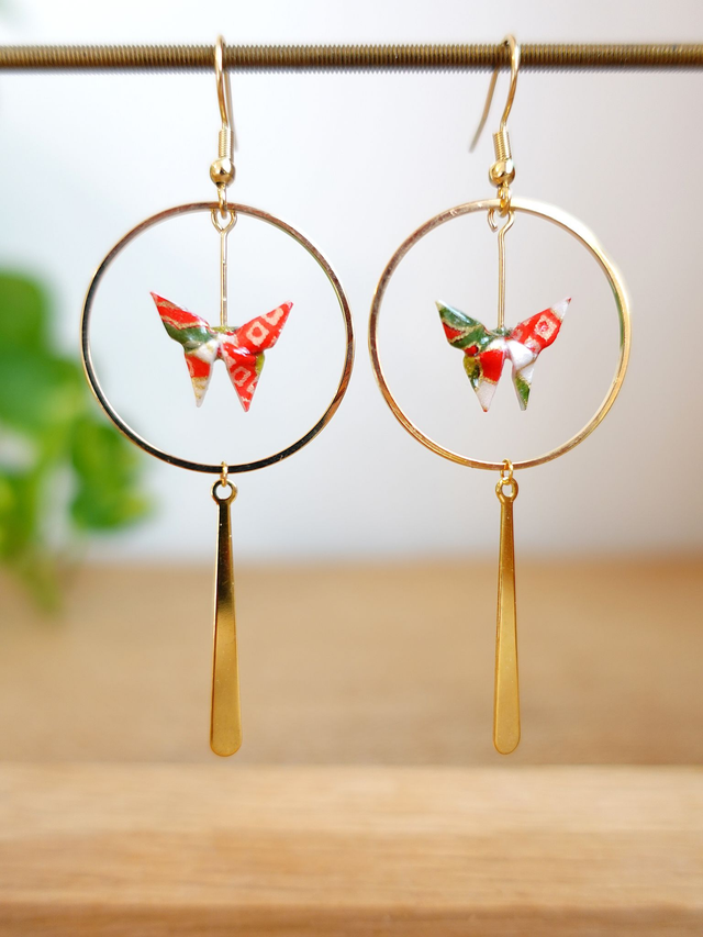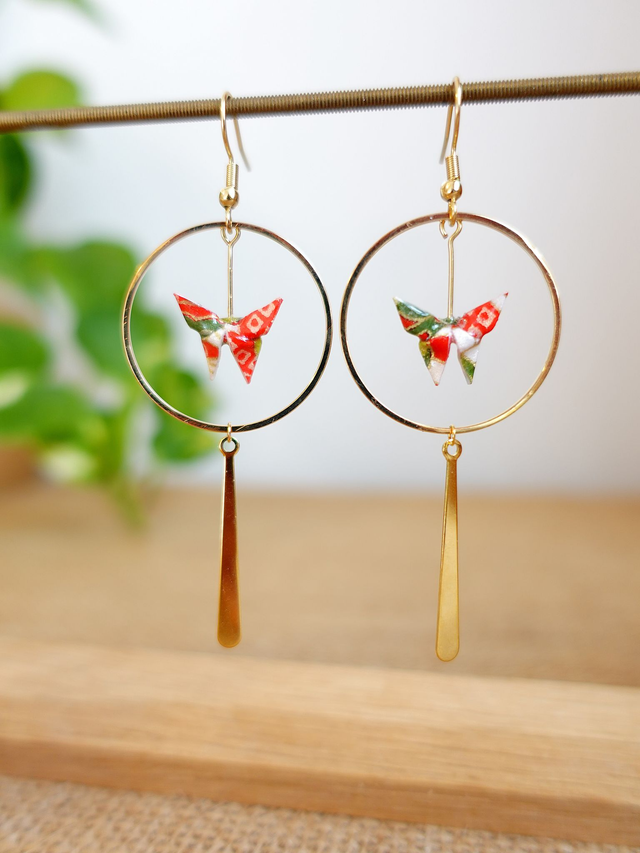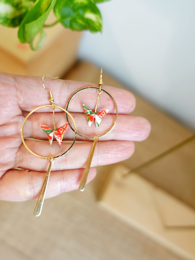 Origami Papillon / INOX doré / Papier japonais washi / Rouge, vert, or / Créoles, anneaux / Bijou japonais origami / Boucles d'oreilles /