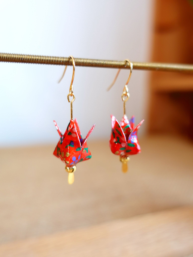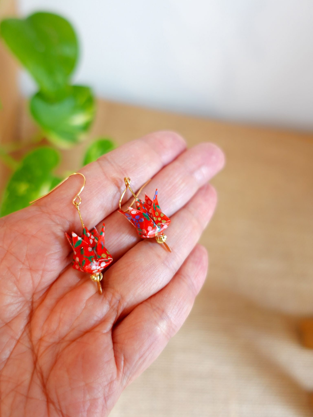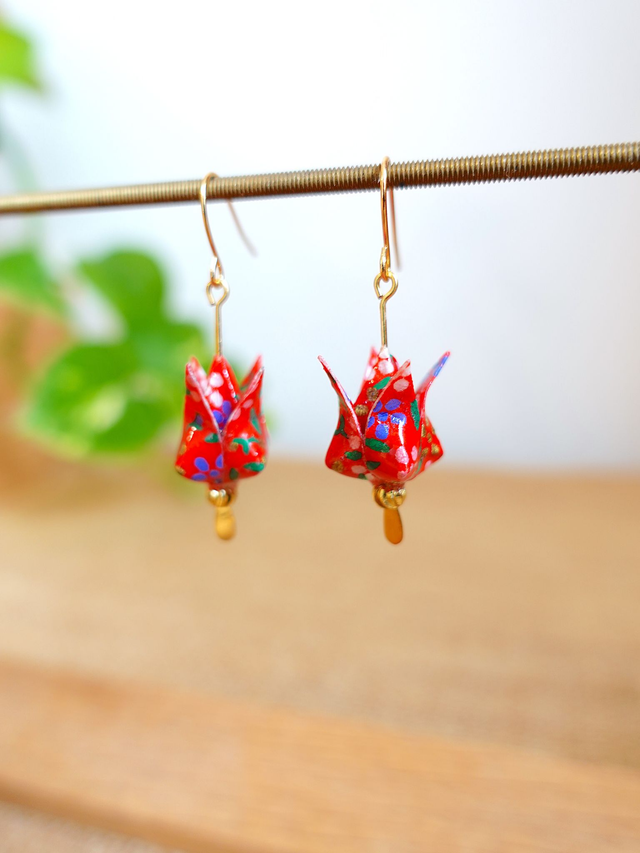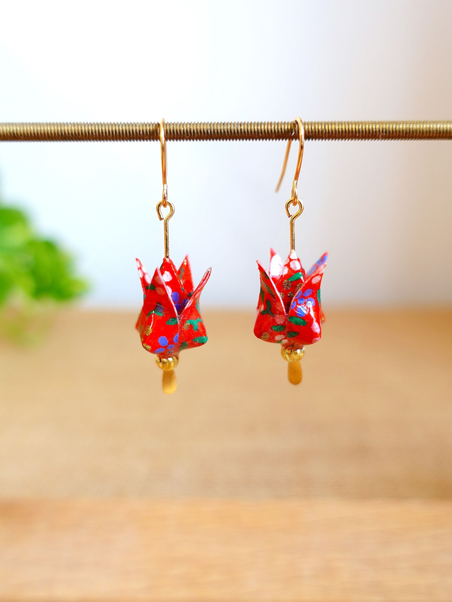 Plaqué or 18k / Origami bouton de lotus / Papier japonais washi / Rouge, or / Bijou japonais origami / Boucles d'oreilles /