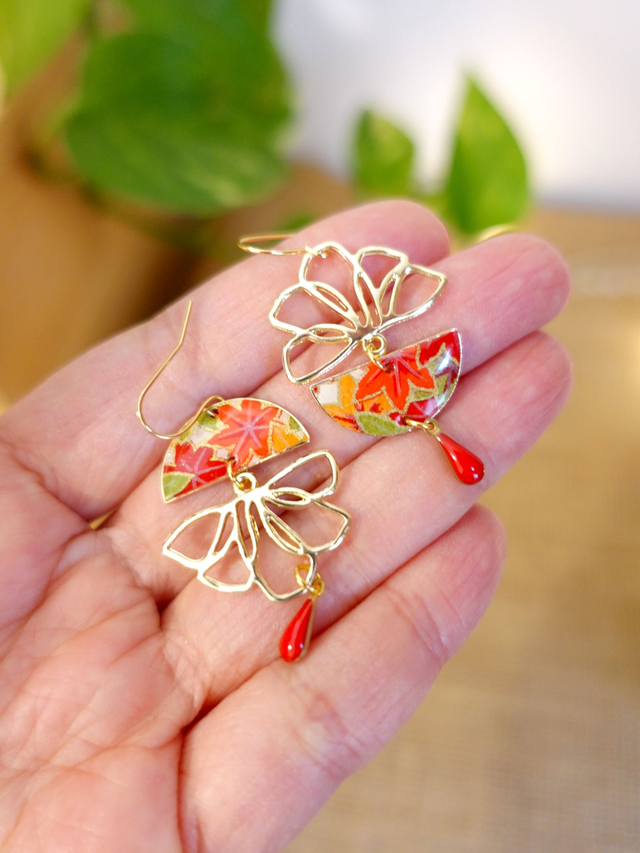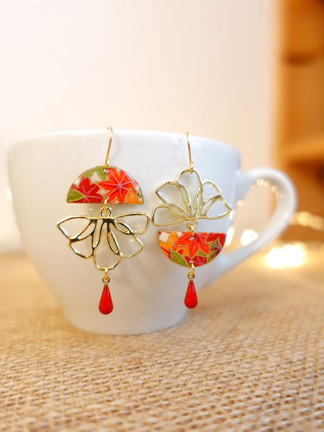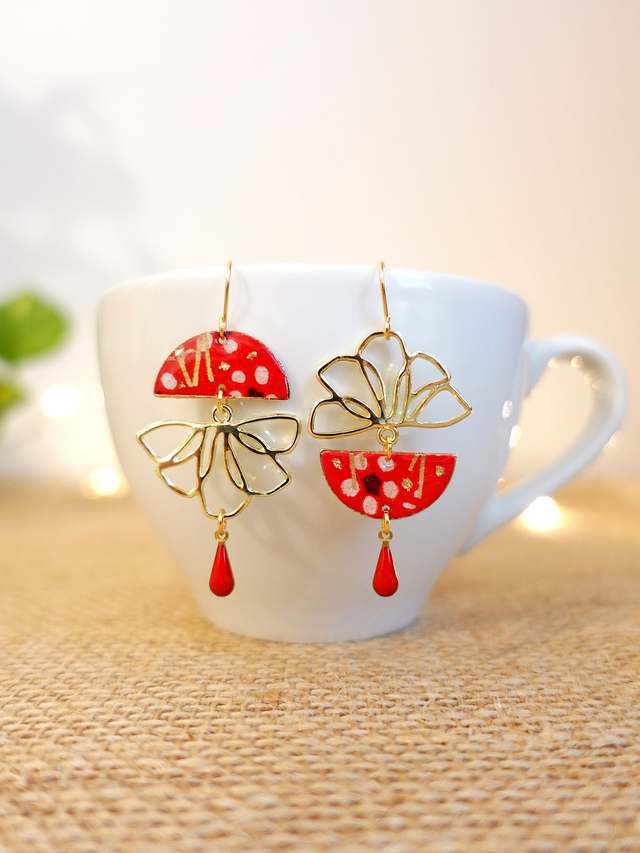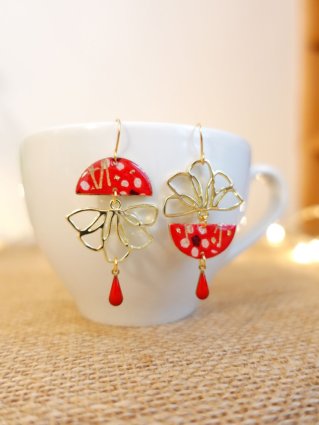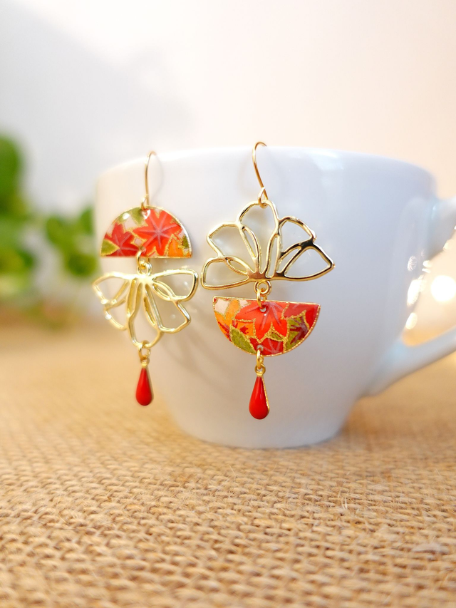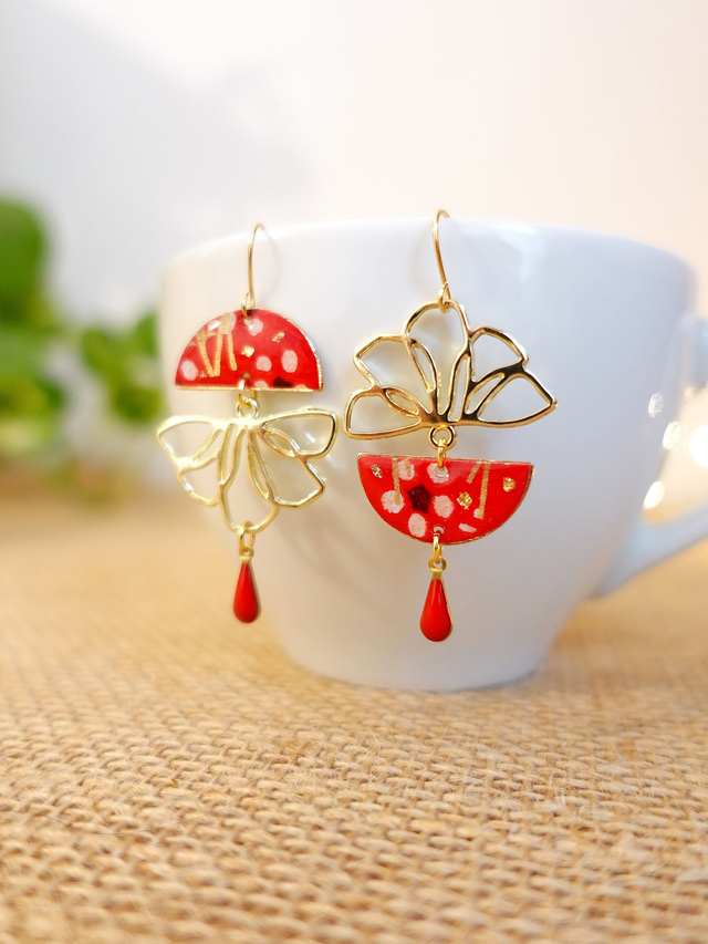 Plaqué or 18k / Papier japonais washi / Rouge, orange, or / Bijou japonais / Boucles d'oreilles asymétriques /