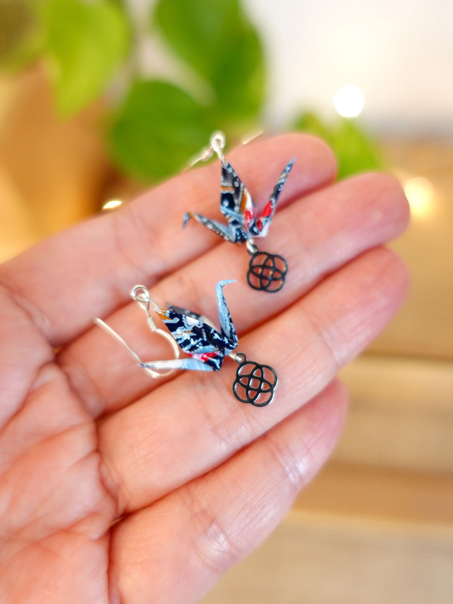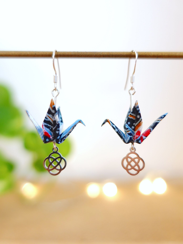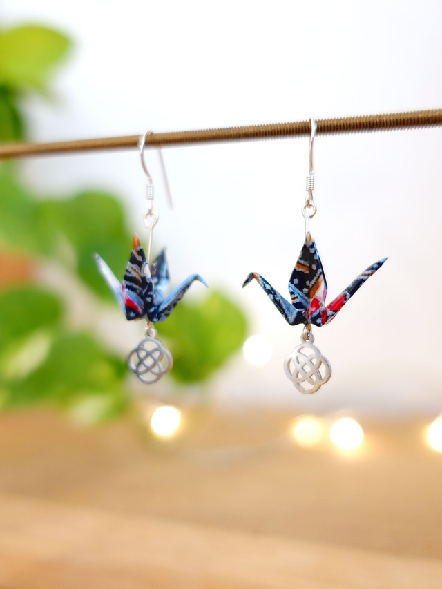 Origami oiseaux, grues / Argent 925 / Papier japonais washi / Noir, Argent / Boucles d'oreilles / Bijou origami /